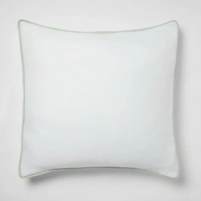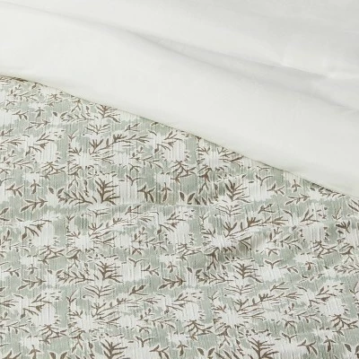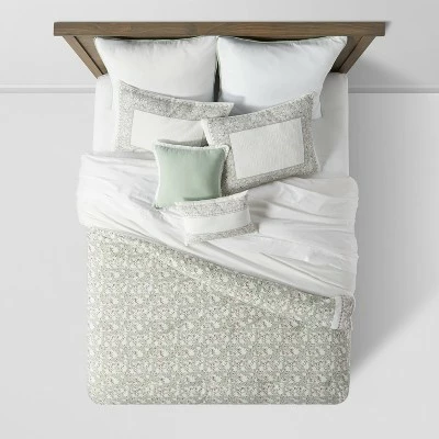 The Richland Floral Comforter Set from Threshold™ will give your bedroom a fresh, blooming update. This eight-piece bedding set includes a soft-filled comforter, two Euro shams, two pillow shams, two decorative pillows and a bedskirt to transform your bedroom into a restful retreat in no time. The comforter features a lovely black and white floral pattern over a textured light green base to brighten the top of your bed with a garden-inspired look. The two Euro shams in white are trimmed with light green edging, the square decorative pillow in green has fringed edges, while the two shams and a rectangular decorative pillow in white have a bordered floral design for a designer look. The bedskirt with 15-inch drop length provides the perfect finishing touch with its crisp white color. Machine-washable for easy care, this percale bedding set will make your bedroom a stunning setup by day and a cozy sanctuary at night.