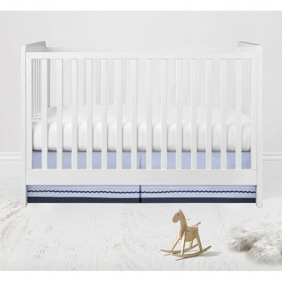 - This Bacati 3-piece Crib Set Includes Reversible Comforter/Playmat (33 x 43 inches), Crib fitted sheet (52 x 28 x 6 inches) and Crib Skirt/Dust ruffle (13 inch drop) in fun, colorful and signature prints in 100 percent cotton 200 Thread Count percale fabrics. Designed in United States by Experienced Designers. Many coordinating items available to purchase separately in this Bacati Little Sailor Anchor Boat Blue Navy Bedding Collection.