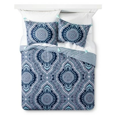 An oversized medallion pattern makes a stunning impression on the Blue Akina Comforter Set from Mudhut. This comforter bedding set has dashes of pale blue including tassels on the corners of the sham. This beautiful comforter and shams are 100% cotton and will feel amazingly soft on your skin! Enjot falling asleep every night with the Akina Comforter Set
