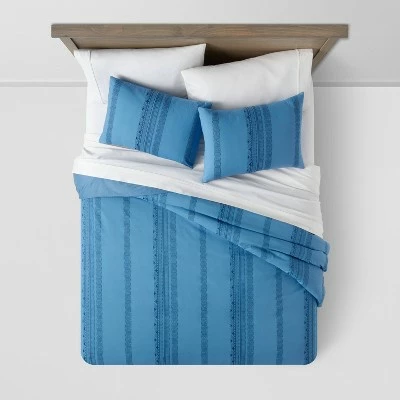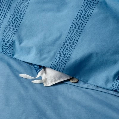 Add rich style to your bed with the Cotton Jacquard-Pattern Duvet Cover & Sham Set from Threshold™. The duvet cover features an elegant jacquard pattern to infuse a touch of luxury into your sleeping nook. Two matching pillow shams complete the coordinated bedroom design. This bedding set is made from a midweight cotton-blend fabric for convenient use. It has button closures and string ties on the duvet cover, and a six-inch envelope closure on the shams for snugly securing the inserts while still allowing for easy removal. Pair this duvet cover bedding set with cream bedsheets to enhance the sophisticated and clean look, and top with throw pillows in coordinating colors to finish a lovely setting.