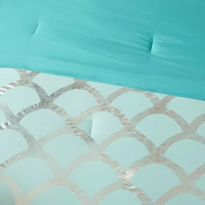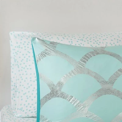 Give your bedroom a modern flair with the Layla Comforter and Sheet Set. The comforter and shams showcases a metallic scallop print on the top of the bed, for striking contemporary look. A solid reverse matches the face of the comforter, while a decorative pillow adds a charming touch. Also included is a complete sheet set that complements the rest of the bedding set. Machine washable, this comforter and sheet set is made from ultra-soft microfiber to provide exceptional comfort for a restful night’s sleep.