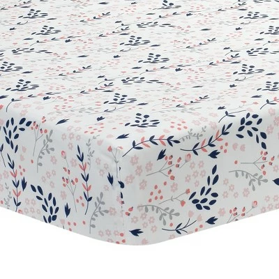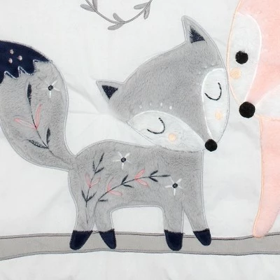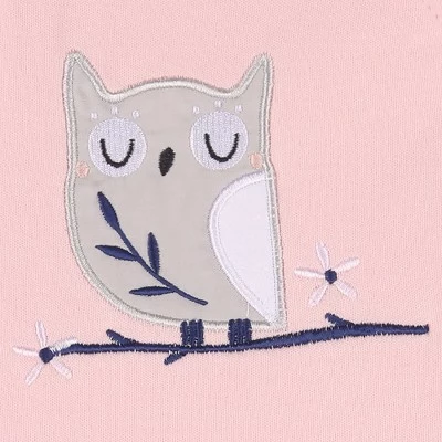 This adorable nursery crib bedding set includes one quilt, one 100% cotton fitted crib sheet, one patterned crib skirt (dust ruffle) and one wearable blanket which is recommended for safe sleep. A sweet gray owl and owlet, mommy and baby foxes and a cute little hedgehog decorate this charming woodland collection. Intricate embroidered flowers and leaves add interest to these darling characters. These characters are made out of a super soft furry minky. The quilt has pom pom trim and is finished with a soft pink ribbed velour border. The back of the quilt is a pretty diamond and flower print. The 100% cotton fitted crib sheet is a floral print in pinks, navy, and gray. Complete the bedding with a pink diamond and flower crib skirt with gray tassel trim which decorates the bottom. The wearable blanket is the fourth piece and is 100% cotton interlock. The chest area has an appliqued gray owl with embroidered details. Wearable blankets are recommended for safe sleep. This fits a size small/medium and is 27β in total length.