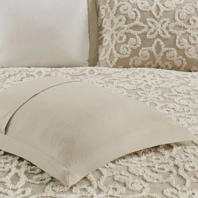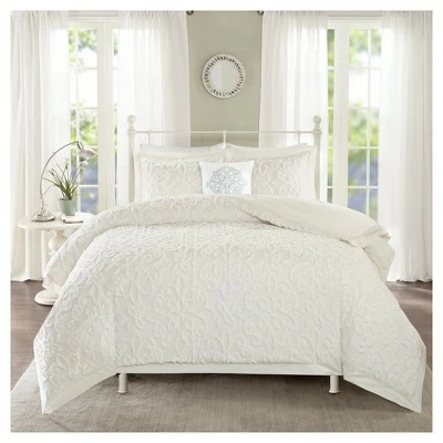 Give your bedroom a cozy shabby chic look with the Amber 4 Piece Tufted Cotton Comforter Set. The cotton chenille comforter and shams flaunt a tufted floral medallion motif, creating a charming farmhouse look. A square decorative pillow adds a rich, textural touch to complete the comforter set. Hypoallergenic polyester filling in the comforter and decorative pillow provides exceptional warmth and comfort. Made with a 100% cotton face and reverse, this tufted cotton comforter set offers a shabby chic update for your bedroom and is machine washable for easy care. Due to the nature of the chenille fabric, some shedding will occur naturally in the first 3-4 washes.
