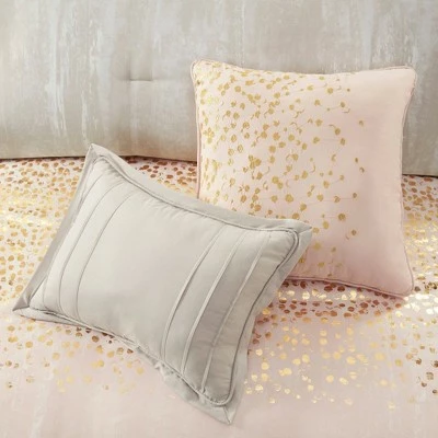 Elevate your bedroom decor with the soft shimmer and shine of the Midnight Sky Metallic-Print Comforter Set. The comforter features a satin charmeuse fabric in a blush hue with a gold metallic foil print in the center, creating a stunning and luxurious look. A solid white reverse adds a soft touch and two matching shams complete the modern comforter set. Three decorative pillows with foil print and pleated details, as well as a solid bed skirt, provide the perfect finishing touches. This metallic print comforter set transforms your bedroom into a modern and glamorous space, while its machine-washable design makes it super easy to clean and maintain.