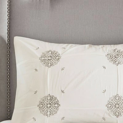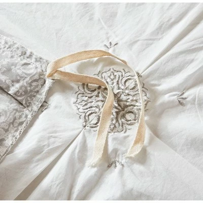 Style your bedroom with the shabby chic allure of the Alicia 4pc Embroidered Cotton Reversible Duvet Cover Set. The face of the reversible duvet cover features tufted embroidery on a soft base, while the reverse showcases an all-over medallion print that complements the top of the bed. Two matching shams mirror the face of the cotton duvet cover and an embroidered medallion design on the square decorative pillow provides an elegant finishing touch to the cotton duvet cover set. Machine washable for easy care, this reversible duvet cover set is made from 100% cotton and provides a comfortable shabby chic update to your bedroom decor. Button closures help secure a comforter insert within the duvet cover and four inside ties in the corners help prevent it from shifting (insert is NOT included).