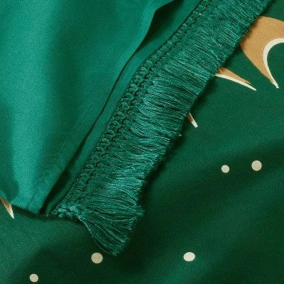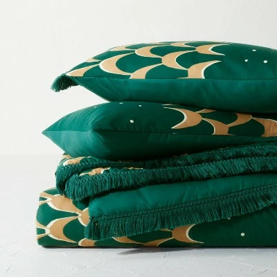 Give a fresh, serene makeover to your bedroom with the Printed Comforter & Sham Set from Opalhouse™ designed with Jungalow™. The comforter features a stylized scale-like print and dots in yellow and white on a rich teal background along with fringed trim for a stunning look. The matching pillow sham completes the coordinated set, and it has a six-inch envelope closure that neatly secures the insert while still allowing for easy removal. This bedding set is made from 100% cotton for convenient year-round comfort, and both comforter and sham are machine-washable for easy cleaning. Pair this bedding set with cream bedsheets to enhance the clean, sophisticated look, then top with throw pillows in coordinating colors to finish a lovely setting.