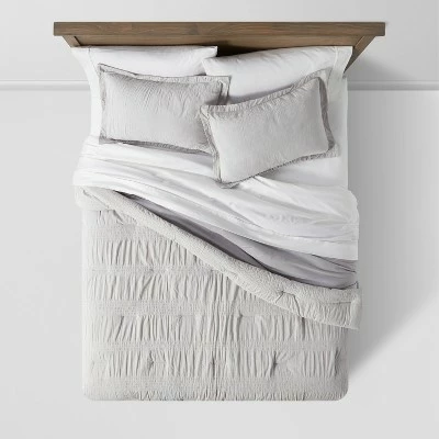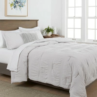 Give your bedscape a lovely textured feel with this Seersucker Comforter & Sham Set from Threshold™. This beautiful bedding set includes a cozy comforter and a matching pillow sham for a coordinated look. Each of the pieces feature a ruched seersucker pattern for a subtly textured look, and a solid color to coordinates with an array of aesthetics. The lightweight and breathable fabric offers comfortable year-round use, while the cozy comforter with soft fill adds a layer of warmth to the top of your bed. Add solid white sheets and other bedding pieces to complete your bedding ensemble, and machine wash for easy care.