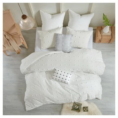 The Urban 7 Piece Duvet Cover set creates a charming space. Featuring small cotton tufts, the duvet cover and matching shams add texture to this solid bedding set. The reverse is a solid pattern and two quilted euro shams add texture. Two decorative pillows are also included in this duvet cover set. One pillow features a pleated design and the other is crafted to match the top of the bed. Made from 100% cotton for easy care.