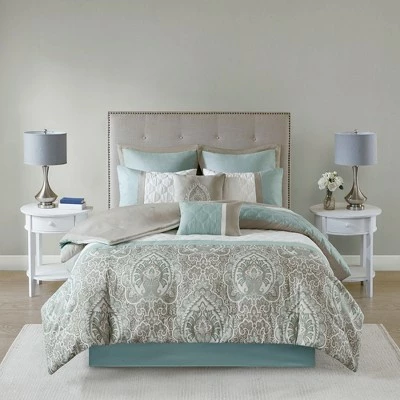 - Transitional 8 piece comforter set in pieced, quilted and damask print detailing