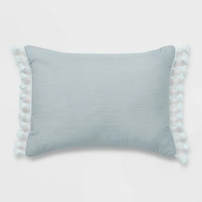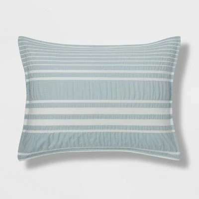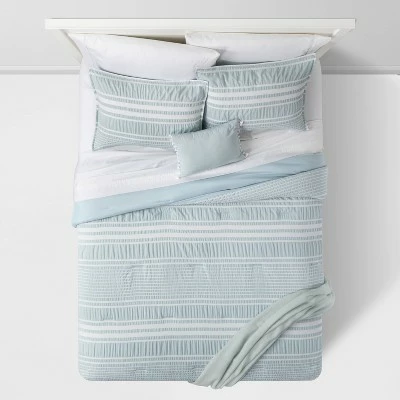 Add soft texture and timeless style to your bedroom with the Chatham Stripe Comforter Set from Threshold™. In light blue and white, this five-piece bedding set includes a soft-filled comforter, a throw blanket, two pillow shams and a decorative pillow. The comforter and shams feature a white striped pattern with seersucker weave to add a beautiful textural look to the top of your bed. A decorative pillow in light blue with tasseled ends and coordinating stripe-textured throw with ornate fringe add the perfect finishing touches. Machine-washable for easy care, this midweight bedding set will make your bedroom a showplace by day and a cozy sanctuary at night.
