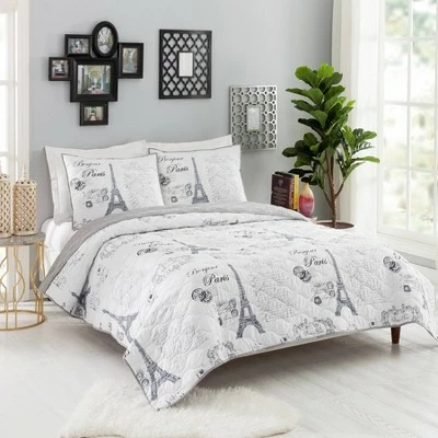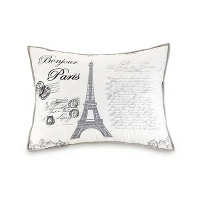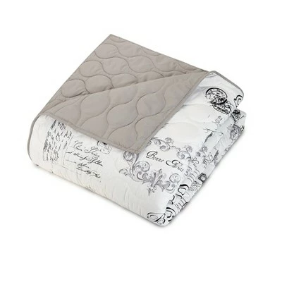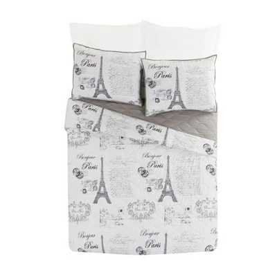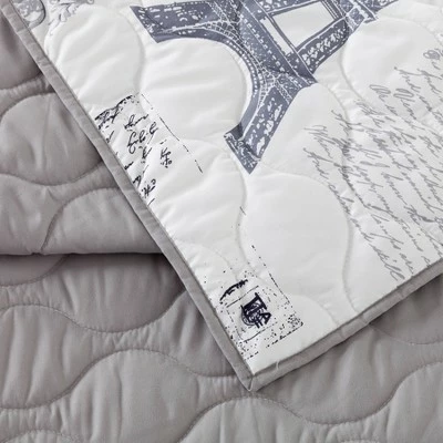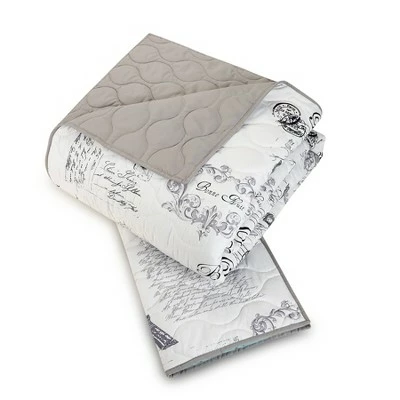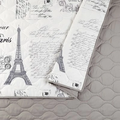 Bring the romance of vintage Paris to your bedroom with the Dreams of Paris Quilt. An elegant collage of postcards, letters, and of course the iconic Eiffel Tower grace this print. The face has a classic ivory ground with black and gray motifs. The printed face reverses to a solid gray reverse. A vermicelli quilting adds texture and loft. All fabric is super soft polyester with a polyester fill.
