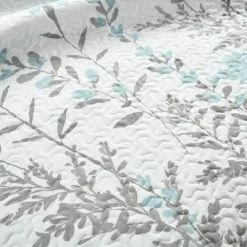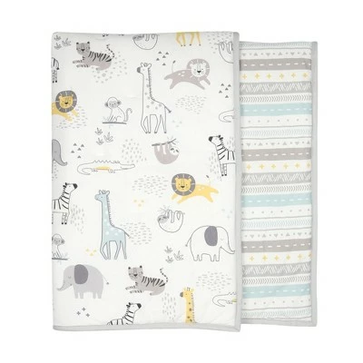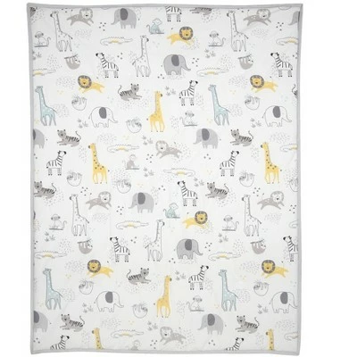 The four-piece nursery baby bedding set includes one quilt, one 100% cotton jersey fitted crib sheet, one crib skirt and a complete set of wall decals. This neutral color palette of jungle animals in shades of gray, taupe, yellow and turquoise is perfect for baby boys and baby girls. Our favorite jungle animals are featured including giraffes, elephants, tigers, zebras, lions, monkeys and sloths on a soft white ground. The back of the quilt is a colorful modern horizontal pattern with dots, triangles, and chevrons. The animal print breathable 100% cotton jersey fitted crib sheet is extra soft for babyβs comfort. It has elastic all the way around ensuring a safe and secure fit. The crib skirt gives the finishing touch to your childβs crib. It is a cotton blend in a light gray twill fabric with a white and gray printed twill tape feature and has a 14 Β½β drop. There are two pleats on the front panel. Complete this jungle inspired nursery collection with a complete set of custom wall decals. They include a gray sloth, monkey, tiger and nine triangular pieces. They look like a custom mural and add a designer touch to a featured wall in the babyβs room. This is a popular baby shower and baby gift registry crib set.