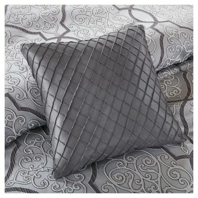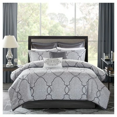The Octavia 12 Piece Jacquard Complete Bedding Set provides a rich luxurious update to your master bedroom. Its jacquard woven fabrication has a three dimensional affect giving this decorative design life. Matching shams and coordinating solid Euro shams complete the jacquard comforter set, while three decorative pillows with embroidery and pleated details work with the two euro shams for a completely new look for your bedroom with the solid bedskirt. A 100% cotton sheet set including two standard pillowcases, flat sheet and fitted sheet are also included in this set. Hypoallergenic filling in the comforter and decorative pillows provide exceptional warmth and comfort. With everything you need to decorate your bed, this 12 piece comforter bedding set is machine washable for easy and offers a stunning update to your bedroom décor.