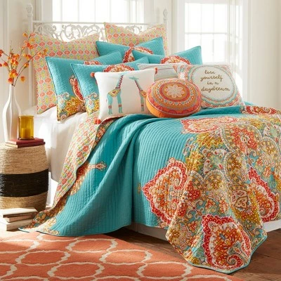 The Mariska Quilt Set by Levtex Home is inspired by the intricate patterning in bright woven scarves. Brightly-colored damasks in orange, yellow and red on a teal ground decorate the this uplifting Quilt Set. The quilt reverses to a kaleidoscope inspired medallion pattern in teal and orange. This machine-washable set is made from 100% pre-washed cotton. The set includes a reversible quilt, and comes with matching pillow shams.