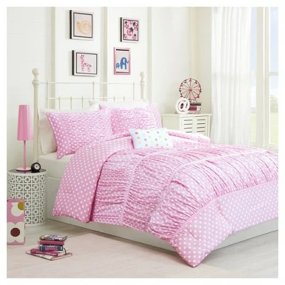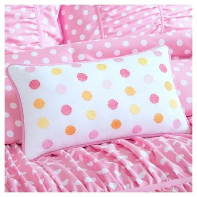 The Marie, Pink Polka Dot Comforter will draw her in with its engaging texture and modern charm and keep her coming back for its warm and snuggly construction. Complete with pleated shams and a decorative accent pillow, this comforter set is a quick and easy way to transform the look of your child’s bedroom.