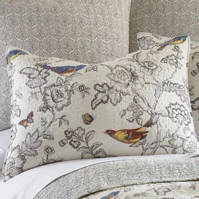 The Mockingbird Reversible Quilt Set by Levtex Home is inspired by traditional french toile patterns. Offered in grey with touches of blue, tan, yellow and rust, this design will immediately transform your bedroom. Made with the softest lightweight cotton, this reversible quilt features a grey floral toile ground accented with blue, tan, yellow and rust birds on the one side, reversing to a grey stamped floral on the other. The Quilt Set has a cotton rich filler and is machine washable and includes the quilt and matching pillow shams. Enjoy this for years to come!
