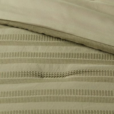 The Westmont Waffle Stripe Comforter Bedding Set from Threshold⢠will give your bed a soft surface texture and pattern. The solid-hued comforter is adorned with waffle stripes for a stunning aesthetic that will complement any bedroom decor. The set includes a square and a rectangular decorative pillow with waffle or channel-stitch stripes, as well as a matching pillow sham, to coordinate on the top of the bed for a cohesive look. This comforter bedding set features a year-round fabric construction for comfortable use. Pair it with white bedsheets to enhance the sophisticated and clean look.