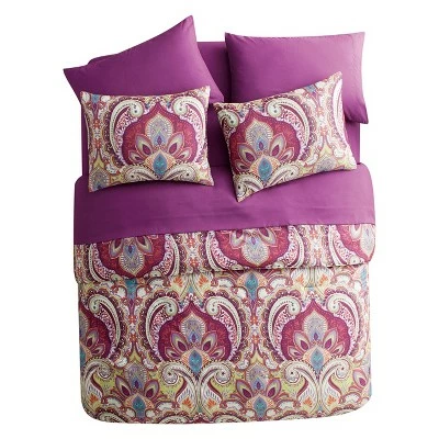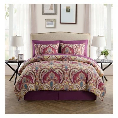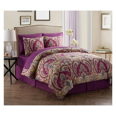 Rich in color and exquisite detail, the VCNY Home Alissia Damask Comforter Bed-in-a-Bag Set has everything you need to bring a cool, global vibe to your space. Made of soft microfiber, this 8-piece bed set features a bold paisley design and includes a comforter, shams, bedskirt, flat sheet, fitted sheet, and pillowcases for a bohemian-inspired look youโll love.