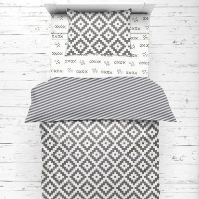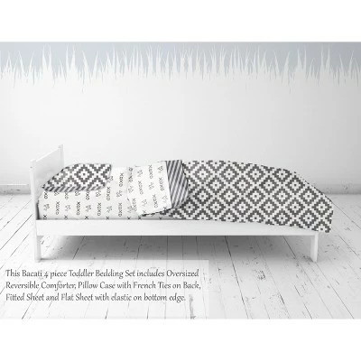 - This Bacati 4-piece Toddler Bedding Set Set Includes Reversible Oversize Comforter (42 x 55 inches), Toddler Bed Fitted Sheet(52 x 28 x 6 inches), Toddler Bed Flat Sheet(52 x 42 inches) which is fitted at the bottom to make the bed easily and Standard Pillow Case (20 x 25 inches) with french ties on the back in fun, colorful and signature prints in 100 percent cotton 200 Thread Count percale fabrics. Designed in United States by Experienced Designers. Many coordinating items available to purchase separately in this Bacati Love Aztec Print Gray Bedding Collection.