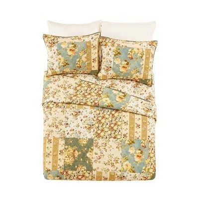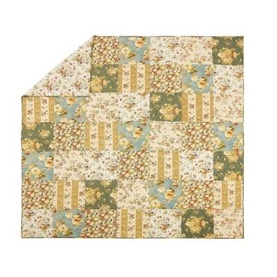 Add some vintage romance to your bedroom with this beautiful quilt. Patches in a lovely mix of floral prints including bunches of roses, bursting bouquets, and rich textured prints. A thoughtful color palette of blue, gold, pinks, and greens give a cozy warm glow. All over double diamond quilting ties everything together. 100% cotton face and fill with a brushed polyester backing.
