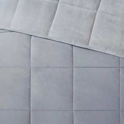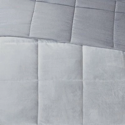 - Yarn dyed grey chambray microfiber reverses to frosted print plush down alternative comforter