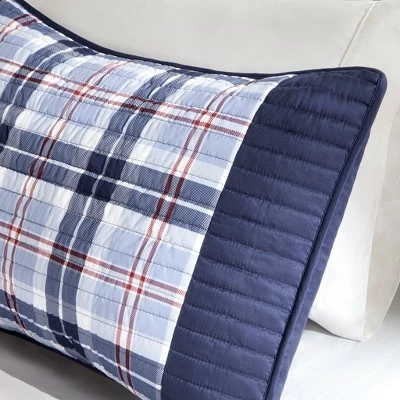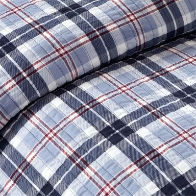 The Lance Plaid Reversible Coverlet set is perfect for any young man’s room. Its mix of light blue and dark blue plaid with a hint of red stripes gives a little splash of color without overpowering the plaid pattern. A solid dark blue reverse adds a rich touch of color to coordinate with the top of bed. The shams have a solid dark blue on the back and a solid dark blue stripe on the front to tie it all together.