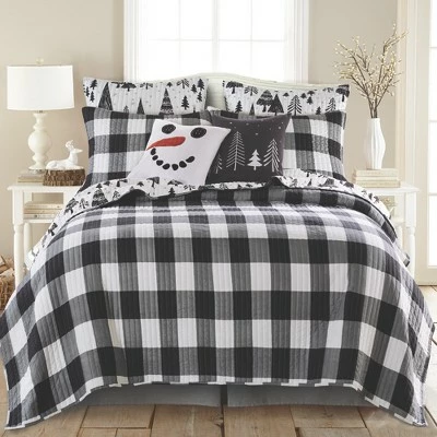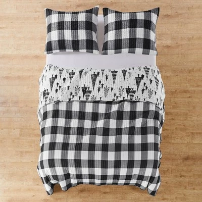 The Northern Star Reversible Quilt Set by Levtex Home is inspired by a contemporary christmas landscape. Offered in shades of black and white, this design will immediately transform your bedroom. Made with the softest lightweight brushed microfiber, this reversible quilt features a decorative christmas tree design, reversing to a chic buffalo plaid in black and white on the other. The Quilt Set is machine washable and includes the quilt and standard pillow shams. Bring the holidays home!