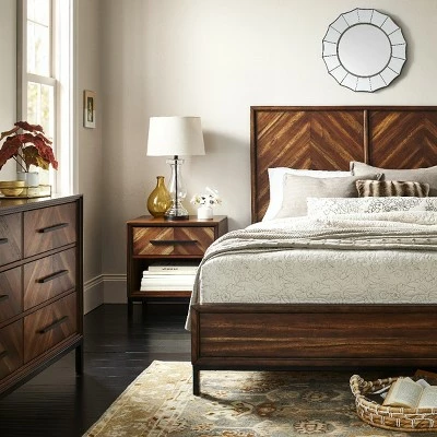 Revamp your space with the sleek and practical style of this Rochester Parquet Furniture Collection from Threshold™. From spacious drawer dressers and nightstands to solid wooden bed frames, this wooden bedroom collection has everything you need to keep your space clean, organized and clutter-free. The spacious pull-out drawers and shelves create additional space when you need it, and the smooth tops offer you ample space to display lamps, books, decor and more. Designed in warm wood tones with intricate geometric patterns for an interesting, stylish look, you can easily work them into your existing bedroom decor to create a space that’s uniquely yours.
