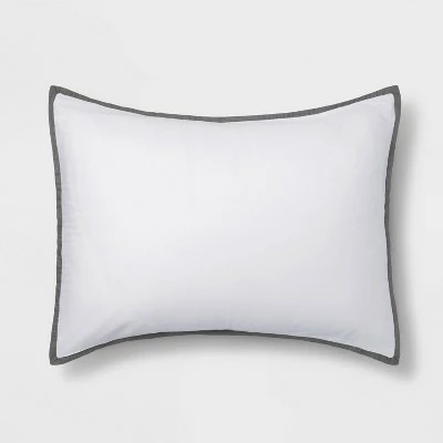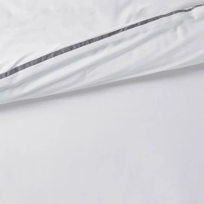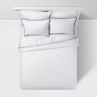Add luxury and comfort to the top of your bed with the Sig Hotel Border Frame Comforter & Sham Set from Threshold™. This comforter bedding set includes a soft-filled comforter and two matching pillow shams to create a chic, cohesive look. All the pieces in the set are decked out in a hotel-inspired design with a solid border in a contrasting hue that frames the crisp white sateen fabric to lend stylish appeal to your room. Made from 100% cotton, this comforter and pillow sham set brings you year-round comfort, while the sateen-weave sheen adds depth and richness to each piece. Plus, the machine-washable design makes for easy care and cleaning — simply add sheets and decorative pillows of your choice to bring a refreshing update to any bedroom’s decor.