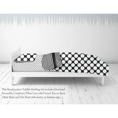- This Bacati 4-piece Toddler Bedding Set Set Includes Reversible Oversize Comforter (42 x 55 inches), Toddler Bed Fitted Sheet(52 x 28 x 6 inches), Toddler Bed Flat Sheet(52 x 42 inches) which is fitted at the bottom to make the bed easily and Standard Pillow Case (20 x 25 inches) with french ties on the back in fun, colorful and signature prints in 100 percent cotton 200 Thread Count percale fabrics. Designed in United States by Experienced Designers. Many coordinating items available to purchase separately in this Bacati Dots Stripes Black/White Bedding Collection.