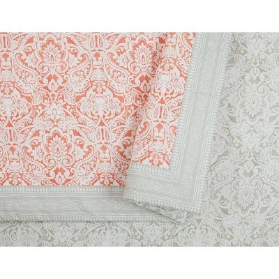 Rejuvenate your bedroom style with the Jessica Simpson Coral Gables Comforter set. The comforter features a painterly damask print on 100% cotton. The face features the damask a lively coral and the reverse is the same damask print in dusty gray. Coordinating decorative pillows sold separately. This comforter set is machine washable.