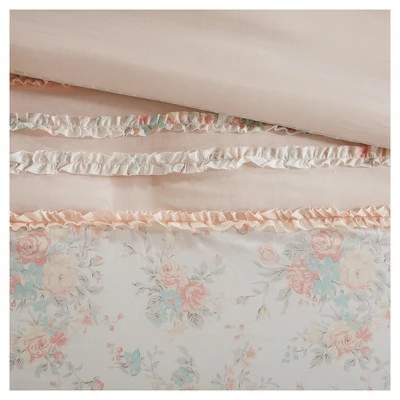 Madison Park Desiree adds the perfect finishing touches to your cottage space. Printed on 180 thread count cotton, this blush and grey floral print is pieced with grey and white polka dot fabric, solid blush and solid grey while ruffle details separate each pattern from each other. A ruffle details finishing the edges and three decorative pillows and two Euro shams (1 Euro sham for Twin sizes) use embroidery and fabric manipulation details to add texture to the top of bed.