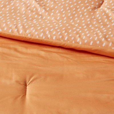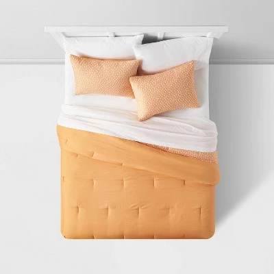 Instantly bring a chic update to your sleeping nook with the Dot-Print Comforter Set with Solid Sheets from Room Essentials™. This decorative comforter set includes one dot-print comforter and two matching sham, two pillowcase, one fitted sheet and one flat sheet, each boasting a soft microfiber construction to ensure you stay cozy and comfy as you drift off to dreamland. The tufted comforter and sham feature allover white dots on an orange background that match the solid orange reverse, while the solid white sheets and pillowcase lend coordinated flair to your bedroom decor. Simply add contrasting pillows in bright hues and a chunky blanket to transform your sleeping nook into a stunning piece of art.
