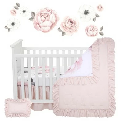 The 5-piece nursery baby crib bedding set includes one quilt, one breathable 100% cotton fitted crib sheet, one shirred crib skirt/dust ruffle, one decorative pillow and one complete set of large flower wall decals. A beautiful shade of pink was selected for this bedding set. The quilt is fully reversible. One side is a gorgeous linen blend fabric with 30 pin tucks along with a beautiful long pink ruffle with a baby hemmed edge. The other side of the quilt is 100% cotton and is a beautiful large watercolor floral print. The breathable 100% cotton crib sheet is a stunning watercolor floral print featuring oversized flowers. This placement sheet makes a great photo opportunity for sharing with family and on social media. The pretty pink linen blend crib skirt is shirred all around and has split corners for easy placement around the posts. It is finished with a baby hem and is 14 Β½β long. An expertly stitched pink pin-tucked linen blend pillow is included with this bedding set. Sized at 19β X 13β with a 2β soft ruffle. Complete this upscale nursery bedding set with a complete set of wall decals. They feature blossoming flowers in various sizes in shades of pink with touches of black and white and dark green leaves. The Floral Garden crib bedding set is a top baby registry item and makes an amazing baby shower gift. Please note: set includes one set of wall decals which contains 8 flowers and leaves; nursery photo is shown with 2 sets of wall decals as additional sets are available separately.