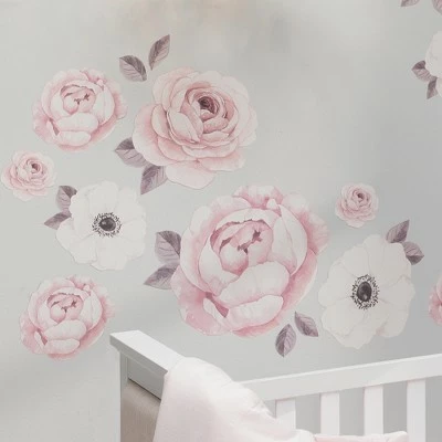 - Custom large floral wall decals add a designer touch to a feature wall in the nursery