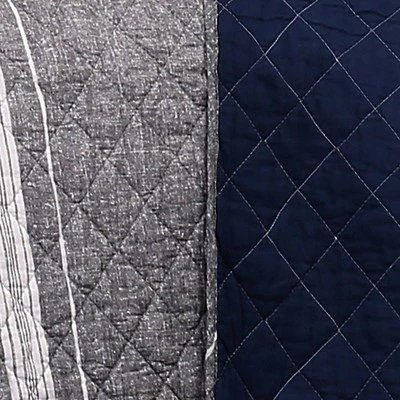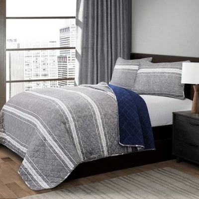 Neutral gray and stylish texture printed stripes come together in this Marlton Stripe Quilt 3 Piece Set. The design is printed on 100% cotton. The reverse side of the quilt features a solid color with quilting details on the back. This Marlton Stripe Quilt 3 Piece Set is ideal for teens and young adults, as well as for guest bedrooms, first apartments and dorm rooms. Being reversible, the Marlton Stripe Quilt 3 Piece Set gives you flexibility with your bedroom design. If you ever decide to change the look of your room, you can simply turn the quilt and shams over. The Marlton Stripe Quilt 3 Piece Set includes a soft reversible cotton quilt and two matching pillow shams, which give this set a complete look right out of the package. This set is available in both full/queen and king sizes. This set is safe to machine wash on the gentle cycle and to tumble dry on low. Please refer to the labels on the product for full care instructions. Part of the Marlton Stripe Collection.
