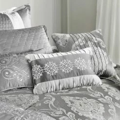- Set includes one comforter, two coordinating shams, one coordinating bedskirt and three decorative pillows