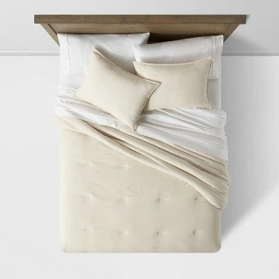 Update your bedroom decor with the Space Dyed Cotton-Linen Comforter & Sham Set from Threshold™. This decorative comforter set includes one full/queen comforter and two standard shams, each crafted from a soft fabric blend to ensure you stay cozy and comfy as you take a nap or sleep through the night. Featuring a subtle space dyed design, this comforter and sham set easily blends with your existing bedroom decor, while giving you an array of choices to decorate your sleeping nook. Simply toss contrasting shams and pillows, and add printed percale sheets to create an inviting resting space.