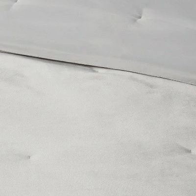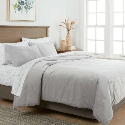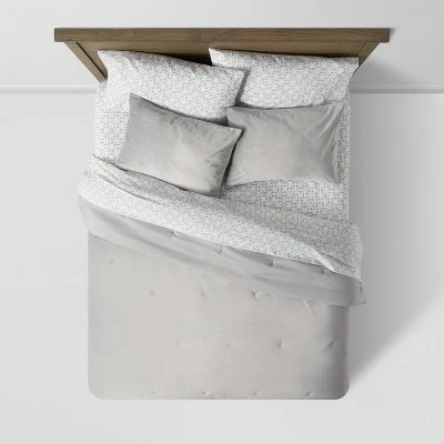 The Vinton Velvet Comforter Set With Sheets from Threshold™ brings the versatility and elegant charm of neutrals to your sleepscape. This bedding set includes a velvet comforter in solid gray, matched with a velvet pillow sham in a complementing shade for a luxurious look and feel. Also included are a flat and fitted sheet and a pillowcase decked out in a gray medallion print over a white base to introduce depth and design into your bedroom. Made from a soft and lightweight fabric, this comforter bedding set brings you year-round comfort, while its machine-washable design makes for easy care.