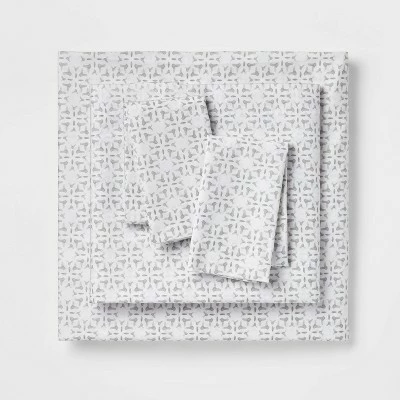 - White and gray printed sheets and a pillowcase provide depth and design