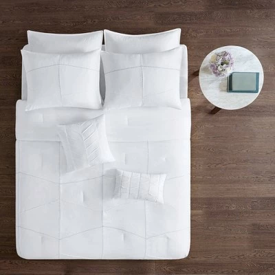 Transform your bedroom with the simple and refined style of the Onida 8pc Comforter Set. The solid comforter and shams feature pintuck details with decorative stitching that add dimension to the top of the bed, for a chic contemporary look. Two Euro shams complement the comforter, while two decorative pillows with fabric manipulation and embroidered details add texture and charm to the bedding set. A solid bedskirt completes the ensemble by providing a clean finishing touch. Made from ultra-soft microfiber, this comforter set is machine washable and brings a modern flair to your bedroom decor.