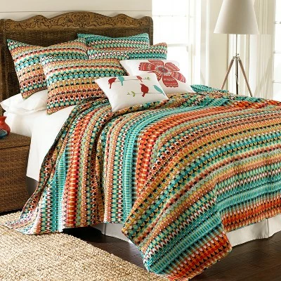 - LEVTEX CORONA QUILT BED SET: A vibrant ikat stripe bedding set consisting of a quilt and matching pillow sham. Used by itself, as a layering piece or as a bedspread, this bedding set is extremely versatile.