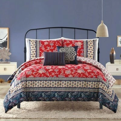 Add vibrant colors and patterns to your room with this comforter set. Jacobean and paisley prints in deep red and blue give this bed a rich look. The comforter reverses to a gorgeous paisley pattern. The two decorative pillows are beautifully embroidered. This comforter is made of 100% cotton fabric with a lofty polyester fill.