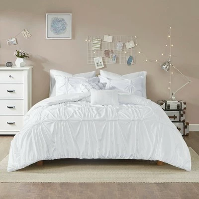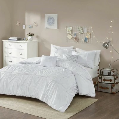 Style your space with the casual elegance of the Rory Tufted Duvet Cover Set with Decorative Pillows. This beautiful duvet cover and sham feature elastic embroidery with pleated panels, adding dimension and charm to the bedding set. Button closures allow you to place a comforter insert within the duvet cover and internal corner ties prevent it from shifting. A square decorative pillow with metallic embroidery makes statement on top of the bed, while an oblong pillow with fabric manipulation provides a charming touch. Machine washable for easy care, this duvet cover set brings a chic look to your bedroom decor.