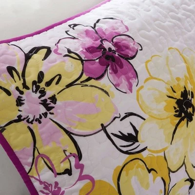 The Skye Reversible Coverlet Set uses bright colors and an asymmetrical floral design to dazzle your space. Pops of teal, green, fuschia and yellow adorn one side of the coverlet while the white base is featured on the opposite side. A solid fuschia reverse adds a vibrant touch of color to coordinate with the top of bed. Two decorative pillows feature floral embroidery and fabric manipulation providing extra dimension to the top of bed. This bedding set is also OEKO-TEX certified, meaning it does not contain any harmful substances or chemicals to ensure quality comfort and wellness.