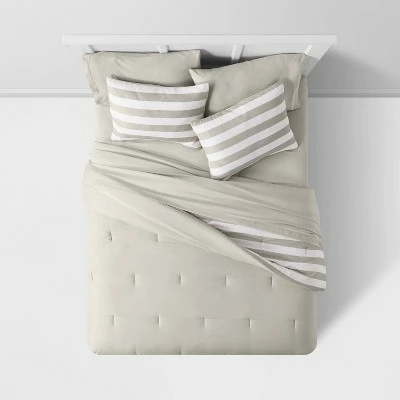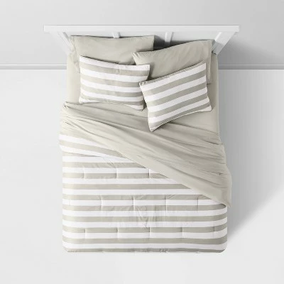 - Striped comforter set includes 1 comforter, 1 fitted sheet, 1 flat sheet, 1 pillowcase and 1 sham