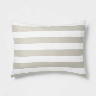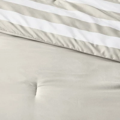 Enliven your bedroom decor with the Striped Comforter Set with Solid Sheets from Room Essentialsā¢. This decorative comforter set includes one striped comforter and one matching sham, one pillowcase, one fitted sheet and one flat sheet, each made from a midweight fabric to ensure you stay cozy and comfy as you drift off to dreamland. The tufted comforter and sham are adorned with beige and white stripes, while the solid beige sheets and pillowcase lend coordinated flair to your bedroom decor. Simply add contrasting pillows in bright hues and a chunky blanket to transform your sleeping nook into a stunning piece of art.