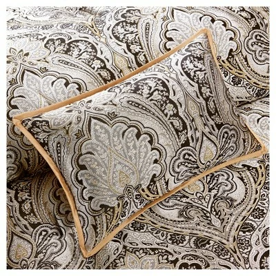Update your entire room at one time with the Tracy Jacquard Comforter Set 24pc. This traditional pattern creates an opulent look in your space with its ornate damask design in rich gold, silver, and black tones. Four decorative pillows use embroidery and fabric manipulation techniques to add dimension to your top of bed while four solid black window panels create the perfect balance to the two valances that match back to the bedding. Four tie backs use the pop of gold from the intricate design for added color in your bedroom. Two solid black euro shams and a bedskirt complete this collection. Set includes: 1 Comforter, 1 Bedskirt, 2 Shams, 2 Euro shams, 1 Flat sheet, 1 Fitted sheet, 2 Pillowcases, 4 Window panels, 2 Window valance, 4 Tie backs (4″x23″ ), 4 Decorative pillows (16″x16″/12″x18″/18″x18″/12″x16″).