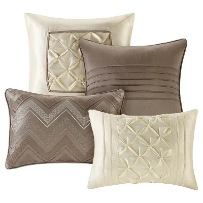 - Decorative pillows (2 square and 2 oblong) with embroidery, pleating, and tufted details