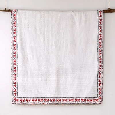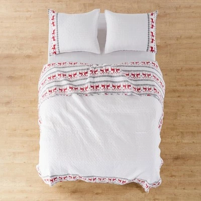 The Rudolph Reversible Quilt Set by Levtex Home is inspired by simple Scandinavian design. Offered in red, black and white, this design will immediately transform your bedroom. Made with the softest lightweight brushed microfiber, this reversible quilt features a white ground quilted with an x stitch and a printed border of reindeer and snowflakes, reversing to the border design expressed as a stripe on the other. The Quilt Set is machine washable and includes the quilt and pillow shams. Bring the holidays home!